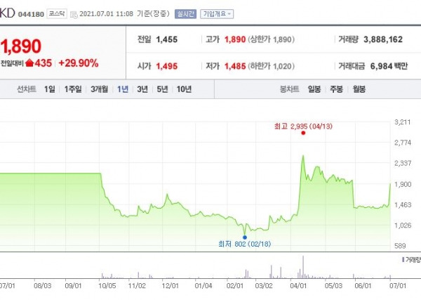 7.044180 : 주가는 1,890원으로, 29.90% 상승했습니다. 이 종목은 최근 1년간 주가가 크게 변동했습니다.
