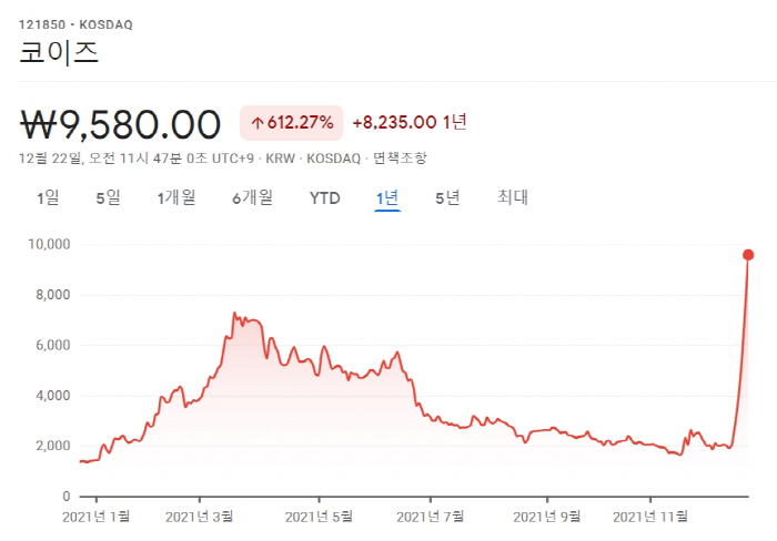 - 코이즈 : 현재 주가는 9,580원으로, 612.27% 상승한 수치를 기록하고 있습니다.